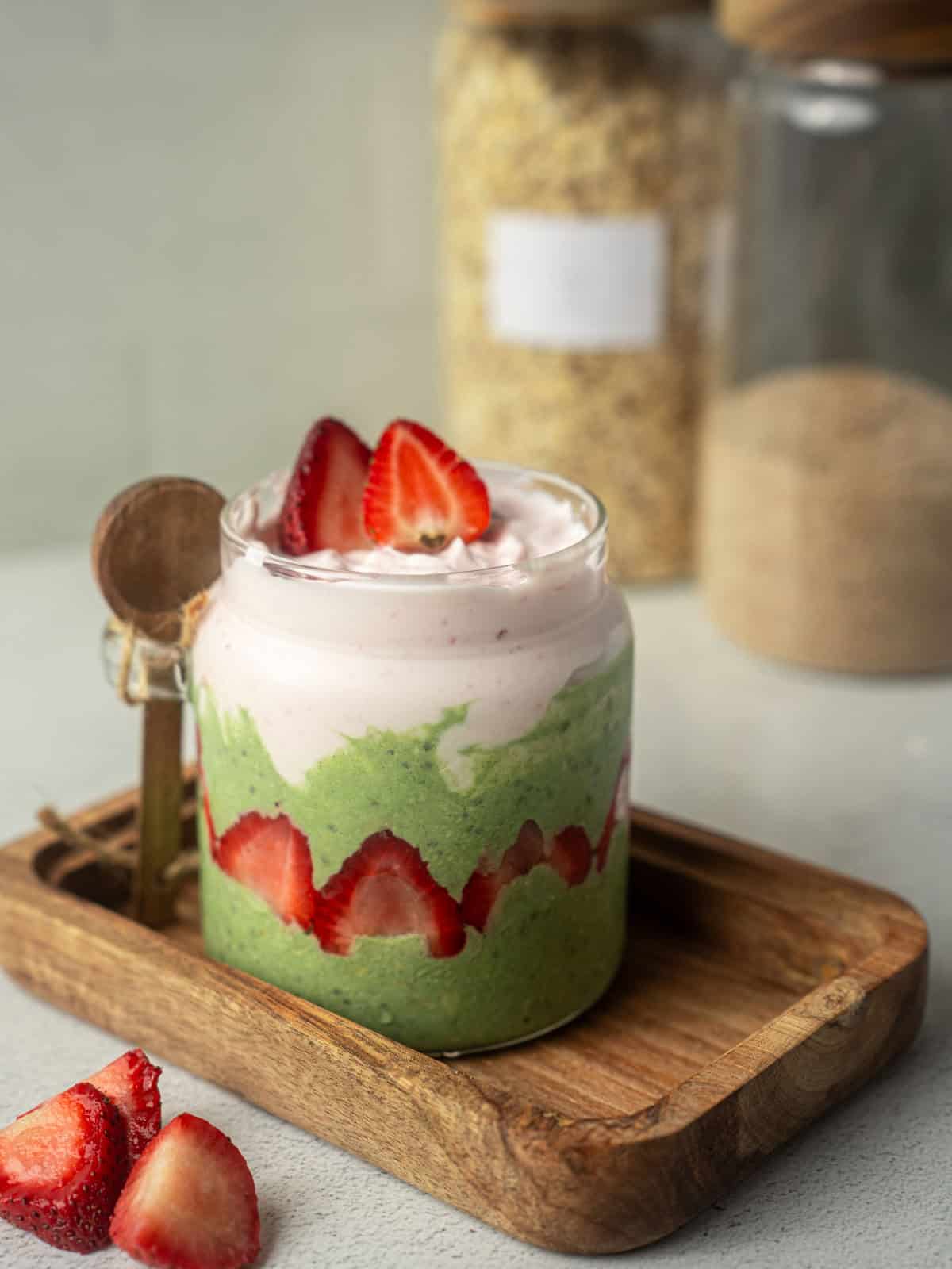 - Assemble: Spoon the matcha oat mixture into the bottom of a serving jar or glass, then top with the strawberry yogurt. Finish with fresh sliced strawberries on top.Extra fresh strawberries